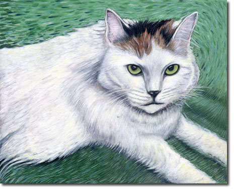 I'm most struck by Todd Belcher's ability to convey the unique spirit of an animal in his paintings, especially given the mishmash of photos I've provided him to use as the basis for portraits. My cat, Helen, had been deceased for a couple of years when I had Todd paint her. The day I hung the portrait, Helen's sister-cat Gertrude, would not take her eyes off it. She stared and stared, convinced that her nemesis Helen had returned from the dead. I don't think anyone could have given the painting a higher compliment!